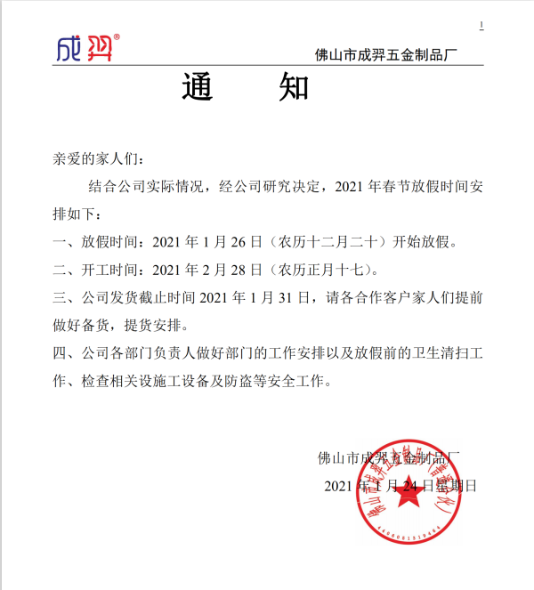 佛山市成羿五金制品廠 小編提醒各位家人年前合理備貨。至于原因,如下:
